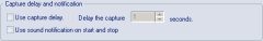 Under the Capture delay and notification heading there are options for delaying the start of the capture (Use capture delay) and for sound notification on start and stop of the capture (Use sound notification on start and stop). When the Use capture delay option is used the delay is specified in seconds in the text box next to the option.