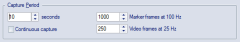 Under the Capture period heading, the capture period is specified in seconds or in number of frames. Fractions of a second can be specified, which will be rounded off to the nearest number of frames. If a Qualisys camera is in Video mode the number of Video frames, the corresponding video capture rate and the maximum number of video frames are also displayed.