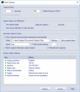 When Batch capture is selected, QTM will make several consecutive measurements. When batch capturing Save captured and processed measurement automatically and the automatic counter must be selected. When Wait between captures is checked the user will be prompted to start each new capture. If unchecked, the next capture will start as soon as QTM is ready after a previous capture. For information on batch capture, see chapter Batch capture.