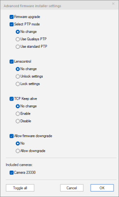 The Advanced Firmware installer settings dialog allows to select or deselect options to be performed as part of the firmware installation.