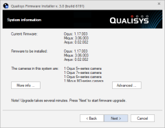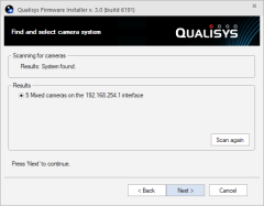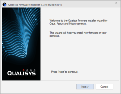The Qualisys Firmware Installer (QFI) is used to install firmware on Qualisys cameras. QFI is organized as a Wizard. In a regular firmware upgrade just click Next until the upgrade is finished, an upgrade may take a few minutes to perform. The steps are described below.