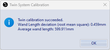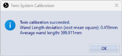 When finished the Twin secondary data is transferred automatically and then you get the result of the calibration. Make sure that the wand length is close to what you have entered and that the standard deviation is not much higher than the deviations of the regular calibrations. If the wand length differs more than 1% of the entered value, it is recommended to redo the calibration.