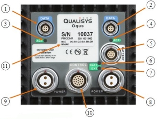 The back of the camera holds six connectors for power, data and control connections. The view differs slightly depending on the type of camera. The image below shows the standard version of the camera. The water protected version uses different connectors and lacks the LEDs found on the standard version.