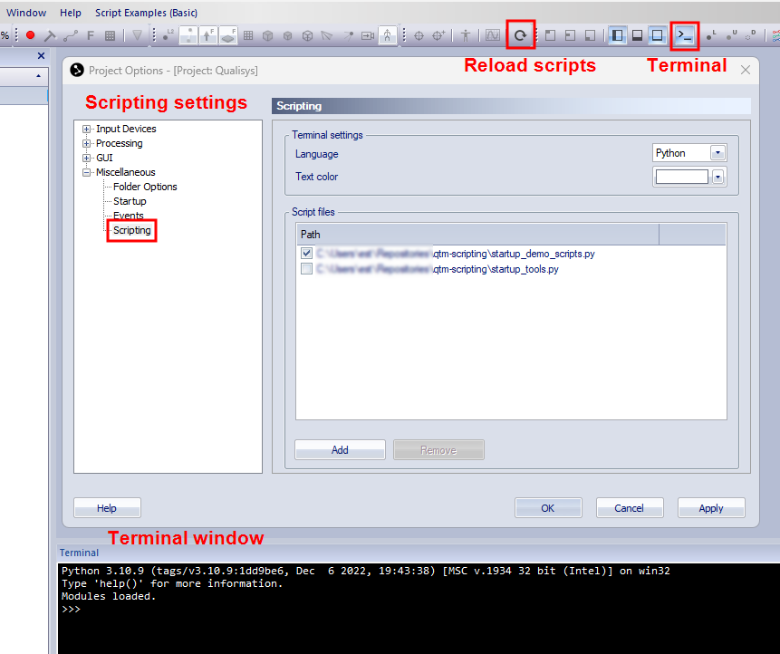 The settings for scripting can be accessed via Project Options > Miscellaneous > Scripting. In the settings, you can select the interpreter language that is used for the terminal and add scripts that are loaded into the project, see chapter Scripting for more information.